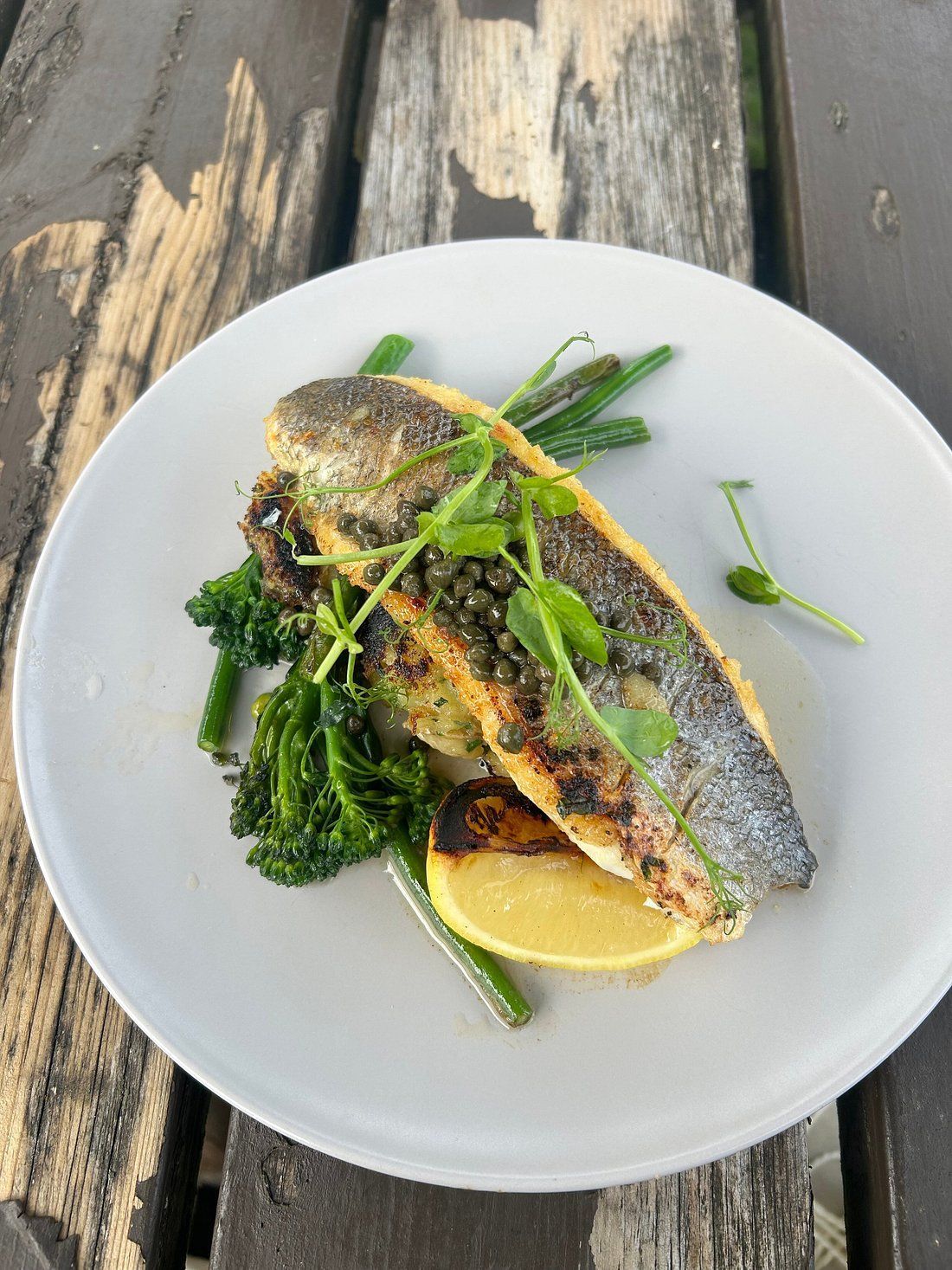 Catch of the day, crushed new potatoes, seasonal veg, capers, lemon butter (gf)